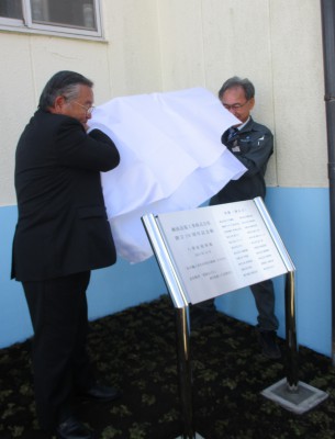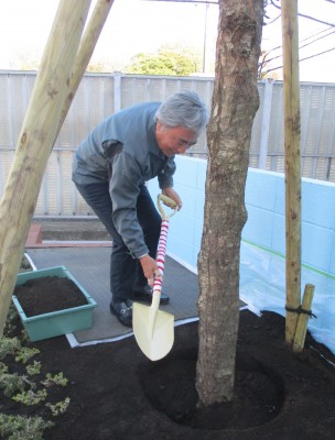 晴れやかな青空の元、参列者1人1人による土かけののち、記念プレートをお披露目。