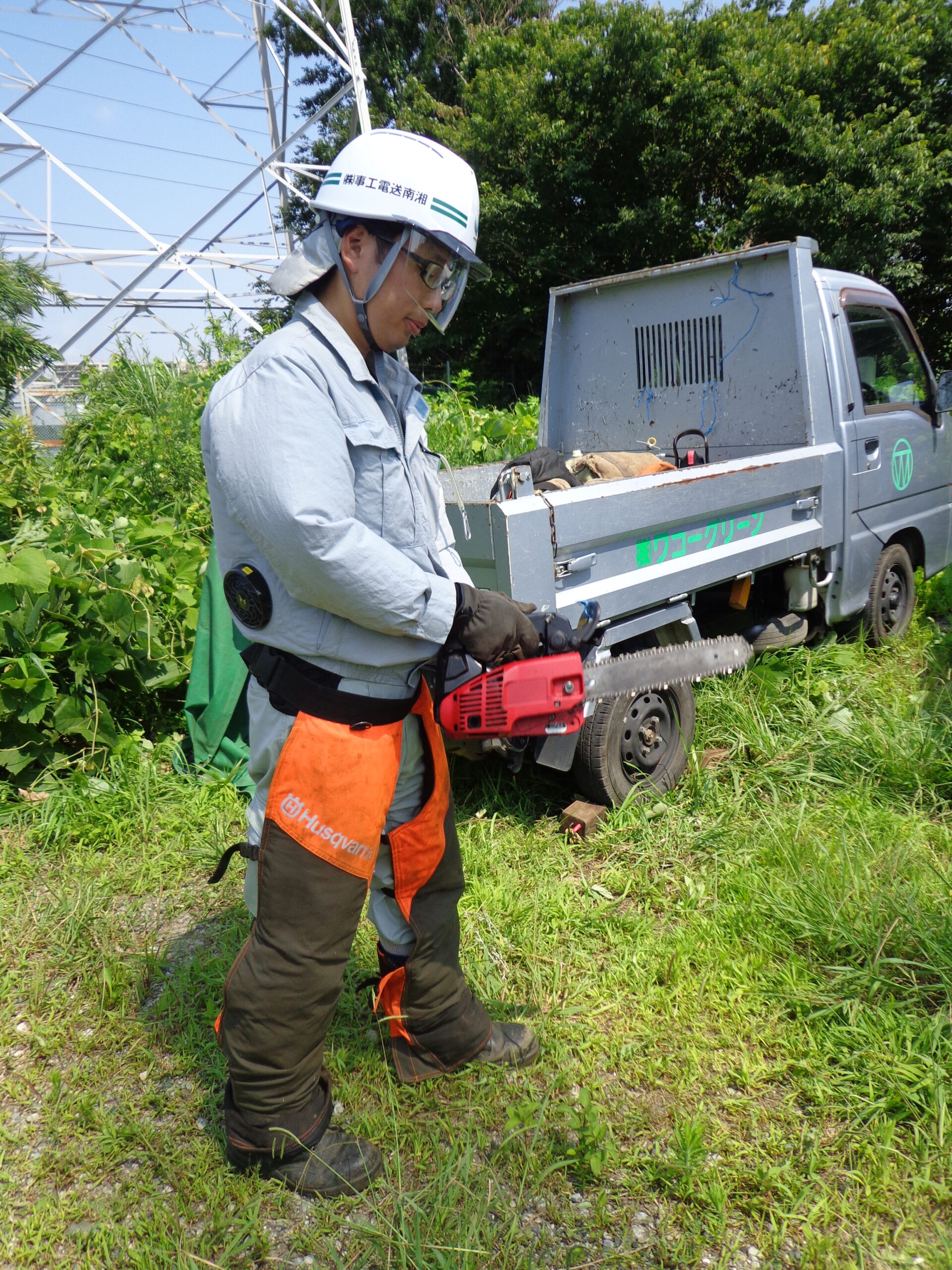 その中のひとつ、「伐採業務」は、送電線下の樹木が伸びて送電線に接近しないよう、定期的に調査をして適切な時期に伐採する仕事。